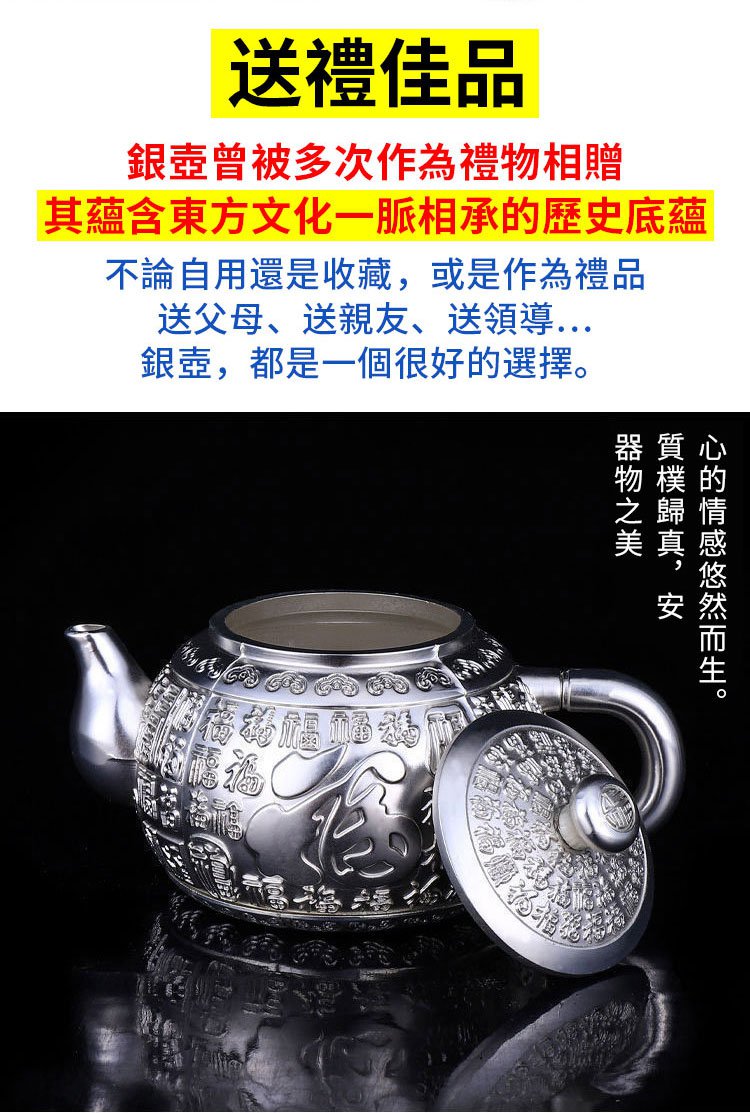 一把好的銀壺也是壹件藝術品,和好的書畫壹樣具有很好的欣賞價值,不僅可供觀賞收藏,亦可陪伴主人喝壹生的好茶,可以世代相傳代代享受銀壺養生功效。