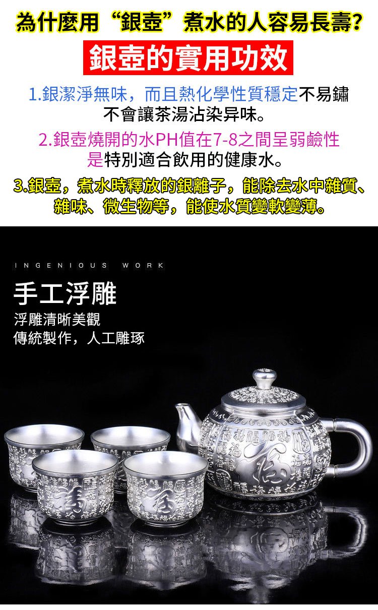 2.銀離子能夠軟化水質。銀壺煮水、泡茶可使水質柔薄爽滑猶如絲絹,口感喉韻更為細膩甘甜,滑順飽滿